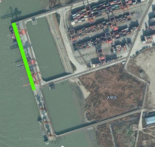 泰州国际集装箱码头有限公司口岸限定区域:国际集装箱码头临时启用泊位作业平台外侧2米宽度区域。(图中绿色区域部分)